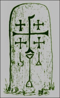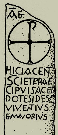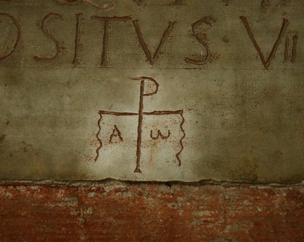 croix gravée sans chrisme, mais avec alpha et oméga.