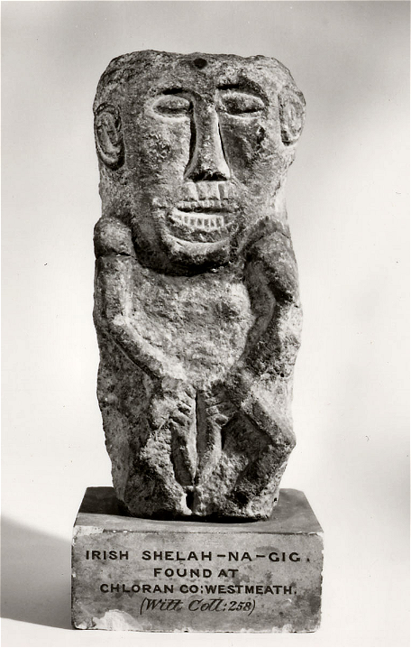 Some vulva-showers are depicted in the emphatic action of pulling up a dress, as at Fuentidueña (Segóvia) which is yet another figure whose head has been removed. See also Lammas in Norfolk, England.