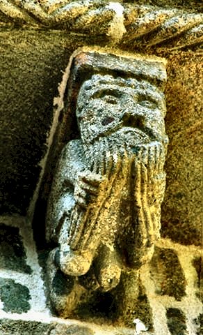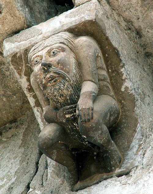 Oyré (Vienne): the Trumpeter of Doom simultaneously pulls the long beard of a sinner.