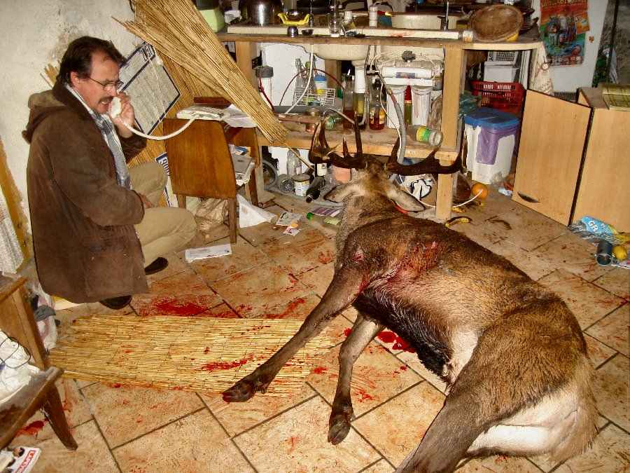 c'est qu'un cerf poursuivi par une meute de chiens à défoncé la porte fenêtre de la maison de nos voisins, toujours suivi des chiens, ils sont entrés dans la maison, ont tout dévasté et finalement a été tué dans la cuisine...