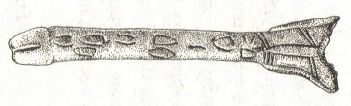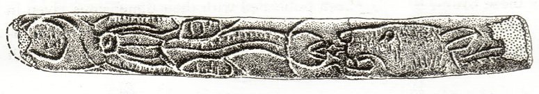 An engraved stone rod from the cave, showing a lion sticking its tongue into the top of a man's serpentine penis.