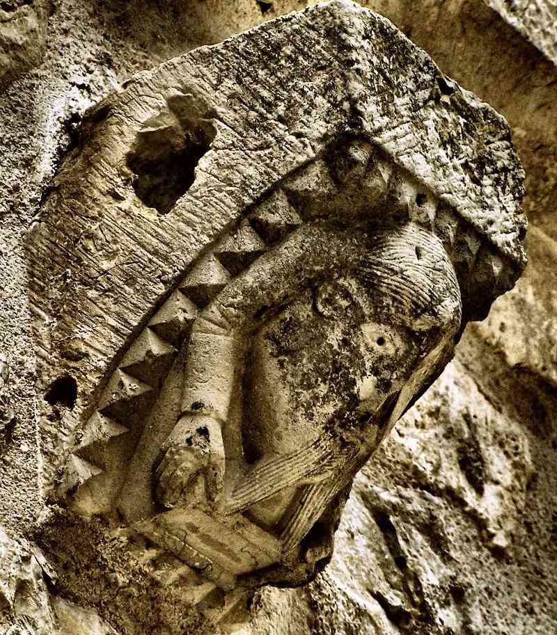 The 'nail-head' decoration around the figure echoes the teeth in the Jaws of Hell - much represented in Romanesque sculpture - and especially those devouring the female exhibitionist nearby.