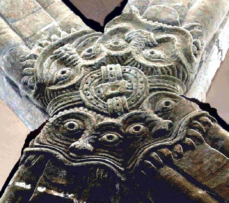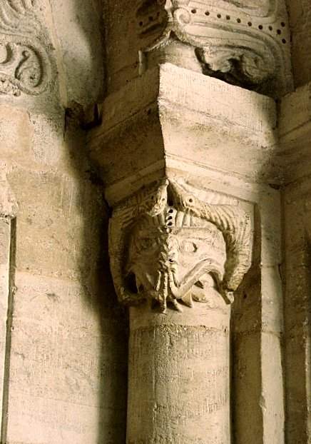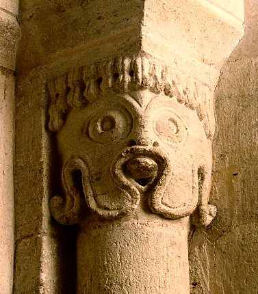 This fine Romanesque church boasts two good single-jawed column-swallowers (one looking like an ancient Greek bronze helmet or mask) - and a remarkable group of "rib-swallowers" on a stone roof-boss.
