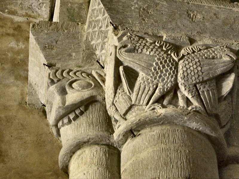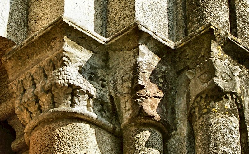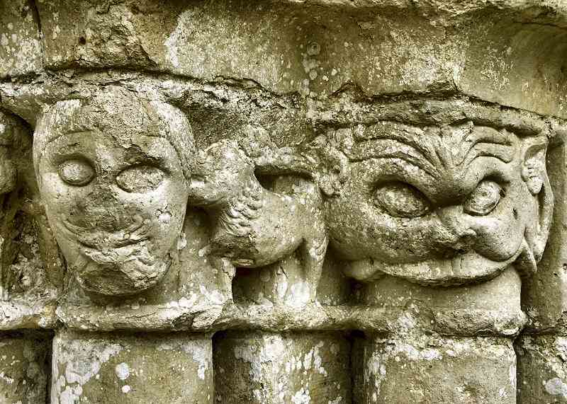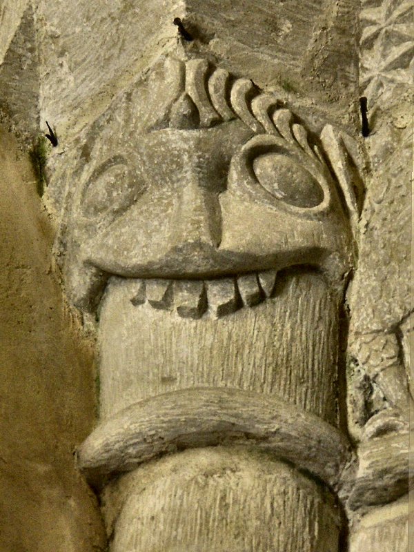 The beast on the left of the doorway is biting the ear of the bearded and moustachioed