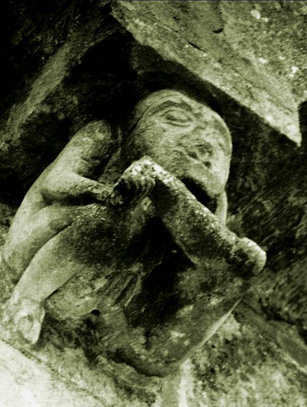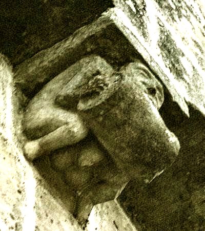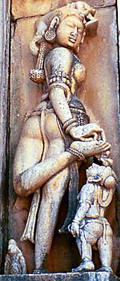 2. A rare example of a female exhibitionist thorn-puller or spinaria, obviously derived from the male version which was itself derived from a surviving Roman statue whose natural nudity shocked the mediæval mind. This figure seems also to be masturbating. The Classical motif of the thorn-puller travelled to Northern India, where a svelte and robed female heavenly being of the kind known as surasandari can be seen amongst the hundreds of figures on the 11th century Parasnath Temple at Khajuraho (Madhya Pradesh) removing a thorn from the sole of her foot. Other temples where the surasandari is found include Ambika Mata temple, Jagat.