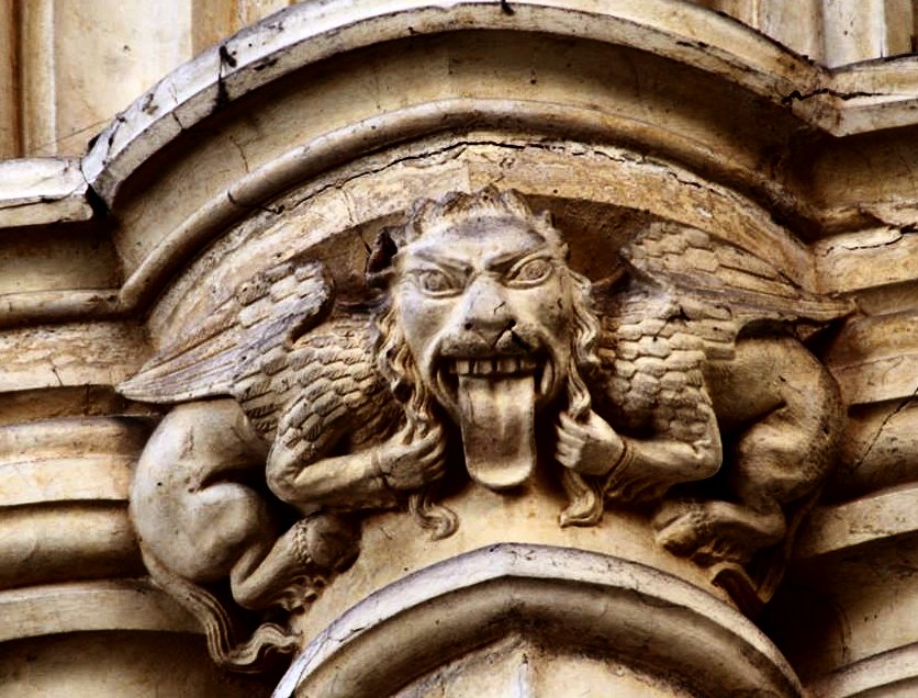 Three remarkable late-Romanesque capitals, the first showing a male exhibitionist being restrained or man-handled by Cherubim.