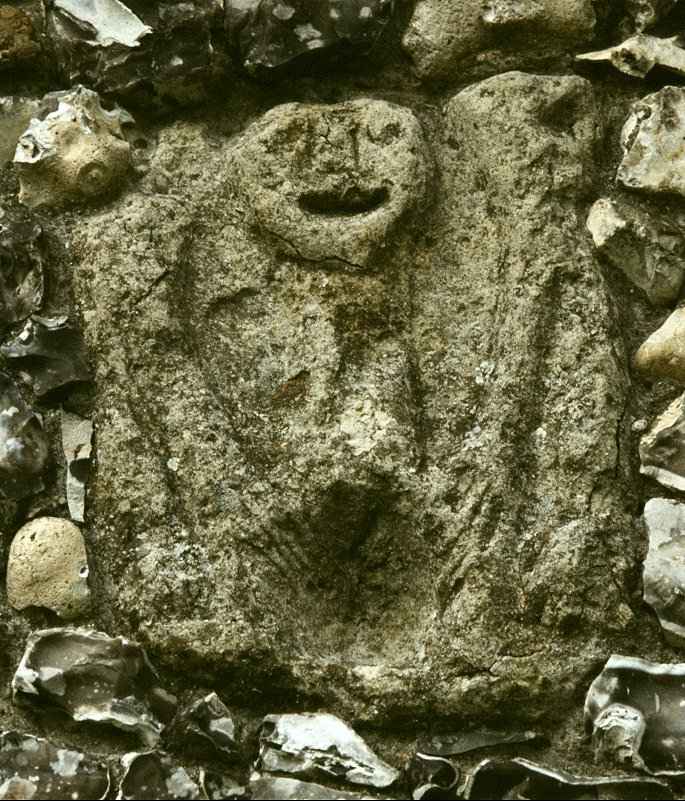 On the South wall of the nave An acrobatic (feet to ears) figure with a huge vulva and a deep grin.