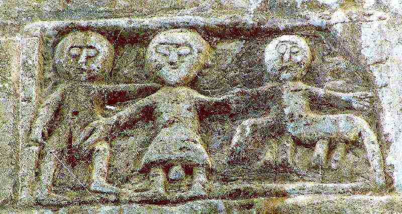 Compare the figures on this stone with the "Three Disgraces" at Burford (above), where the middle figure is carved in a similar manner with a penis peeking from beneath a shift. It's very hard to say what this stone is meant to represent with its confusion of sexual symbolism. (Text by John