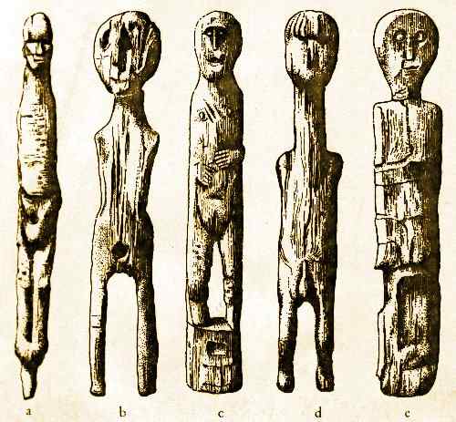 be as late as the 12th. Compare the Lusty More figure with one on an early 12th century font at Cleckheaton in Yorkshire. It is repeatedly claimed without a shred of evidence that sheela-na-gigs are survivals or regnerations of Celtic cults - but no Celtic paradigm has been found, neither in stone, nor metal, nor wood. The nearest antecedents are the archaic 'Baubo' figurines of the Eastern Mediterranean. Moreover the Celts (especially the Irish) were obsessed with the phallus rather than the fertility-goddess or the vulva, as the phallic stones and gateposts of Ireland attest - notably the magnificent Turoe Stone. Below are drawings of small wooden figures from the British Isles and France. For more pictures of these two sculptures go to www.irishmegaliths.org.uk/zCaldragh.htm. |