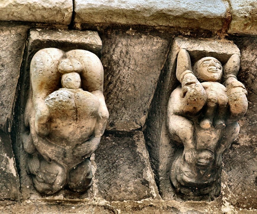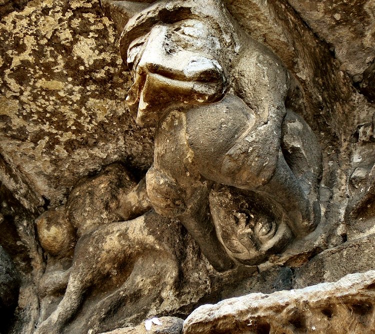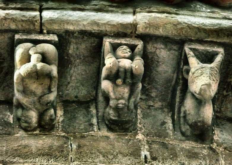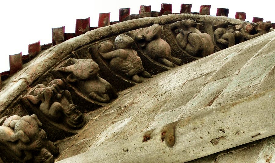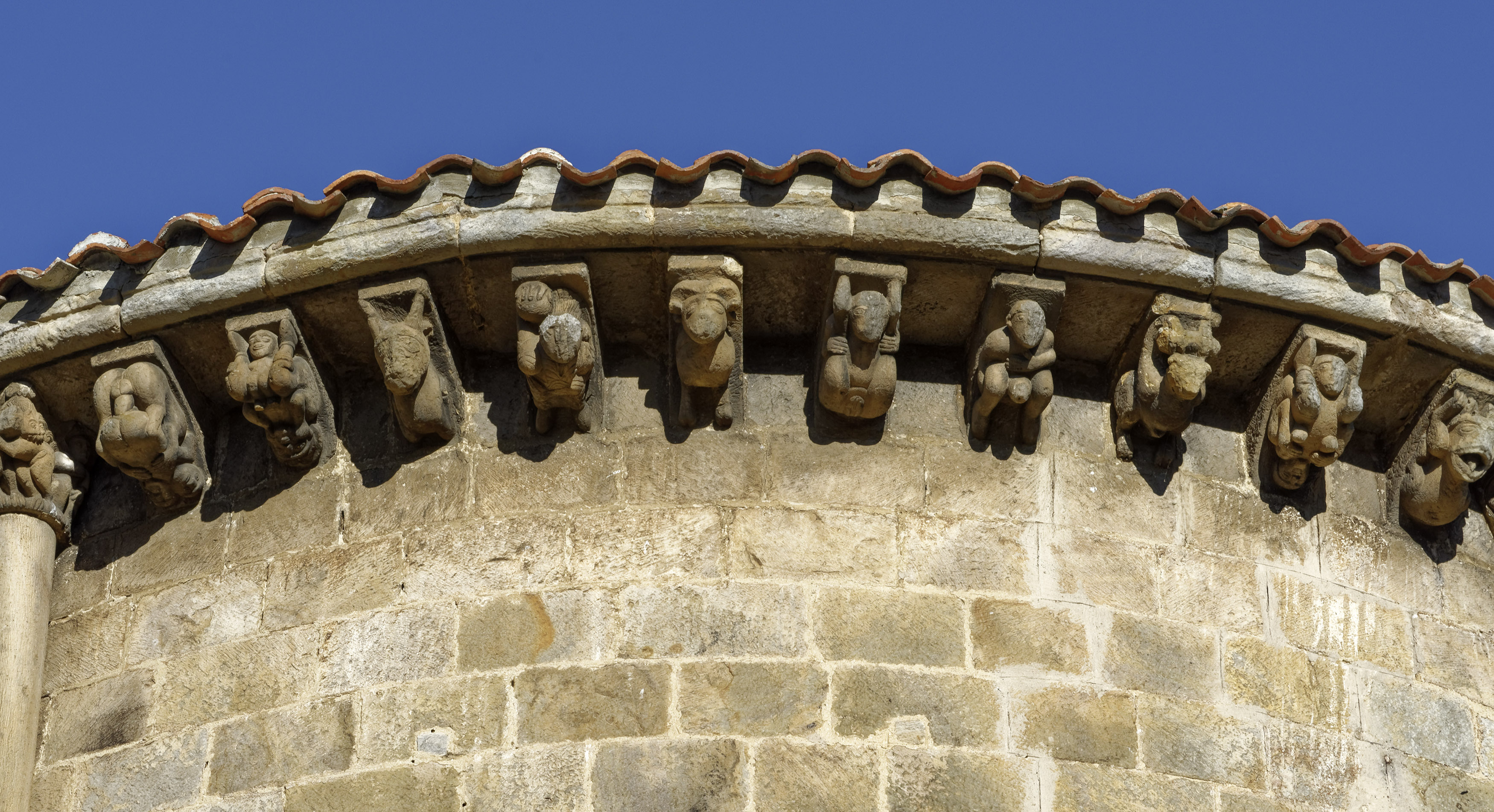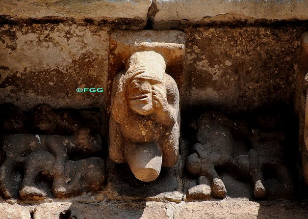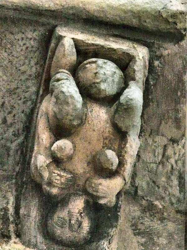 the third corbel from the top right is an acrobatic female similar to one on a window of the apse.