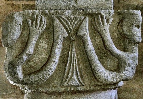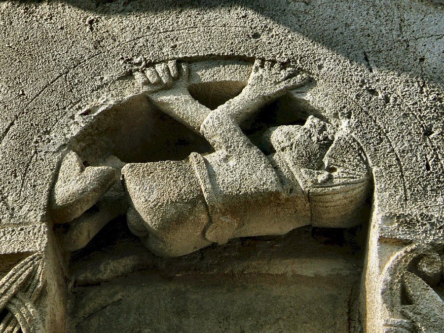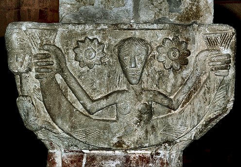 This naked male with large testicles is an atlante, possibly supporting the vault of heaven, empowered by the Belt of Strength around his waist.