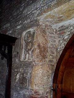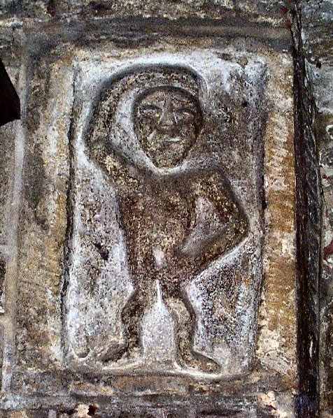 Croft-on-Tees (Durham) The position of the right arm on this figure wittily (or unintentionally) echoes the halo associated with holy beings. The vagina is more discreet than is the case with most sheela-na-gigs, and the breasts are very small. The picture below shows its position by the doorway.