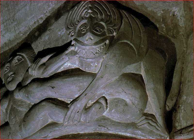 assailed by a slug-like snake (biting a breast), and a kind of wolf-devil.