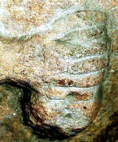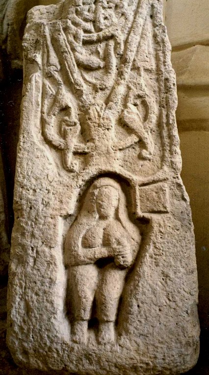 Although the casual observer might interpret this as a representation of the Virgin and Child, the creature or object at her breast is certainly not a baby. Representations of the Virgin and Child did not become fashionable in mediæval art until the introduction of the cult of the Blessed Virgin Mary at the end of the twelfth century. This cross-shaft dates from the 10th century at the latest. Certainly she is grasping something; but it looks very much as if she is trying to remove a toad from her breast.