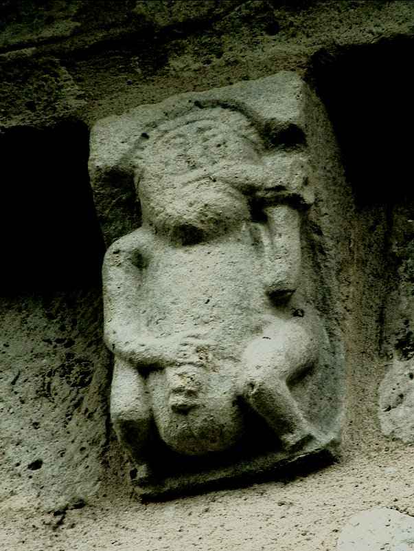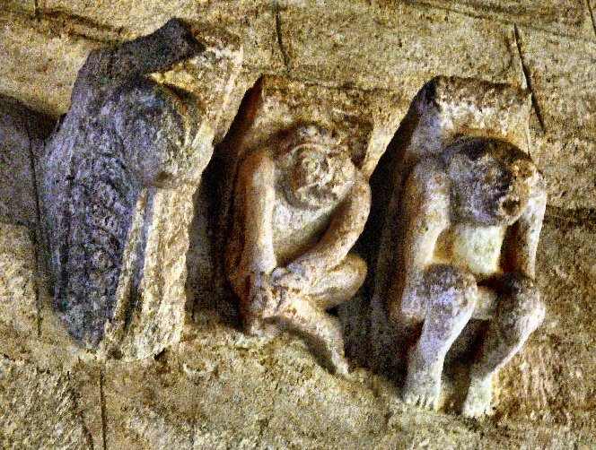 Megaphallic man blowing a horn, a person with a rope, and a squatting figure - presumably entertainers.