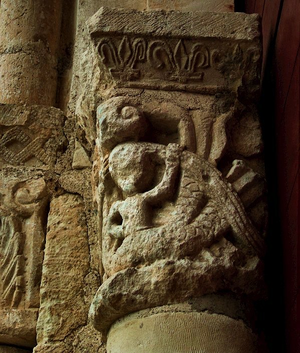 The hair-pulling mermaid on the other (N) side of the doorway is unusual in
