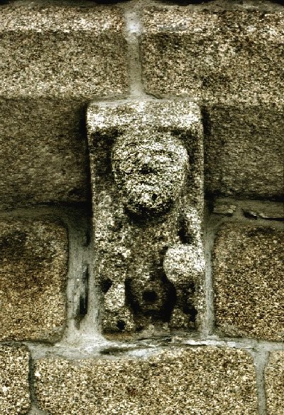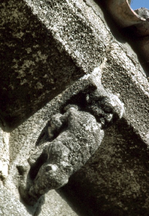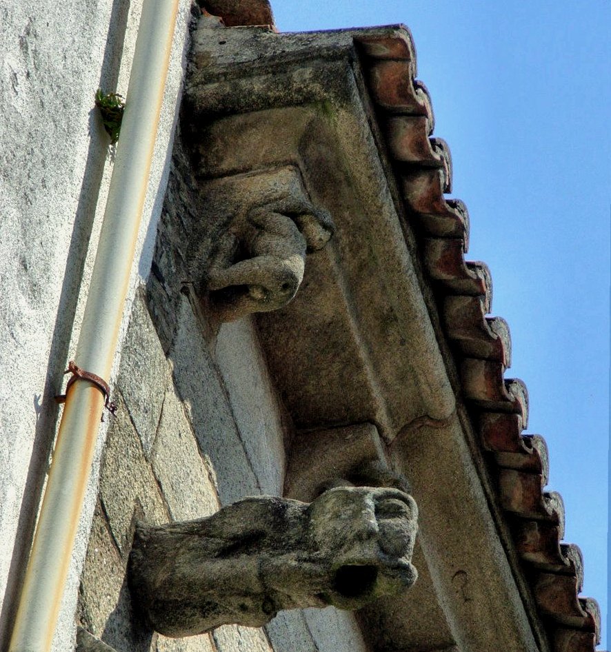 amongst its corbels, and a gargoyle/waterspout inserted into the wall of a